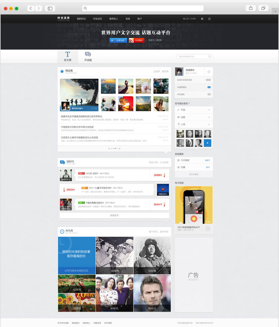 - 作為重點打造的互動交流平臺,作用于記錄時光,分享經歷,不僅以時光軸架起專家和網民的互動討論,也生動化構建了個人的圖文記錄平臺,每個人都可以有自己的傳記并和出版集團的資源優勢結合可以線下出版。
