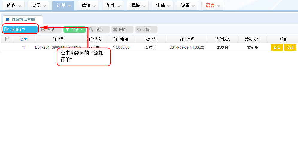 3、說明:此訂單添加屬于附加功能,具體添加訂單最好由用戶在前臺自行進行。