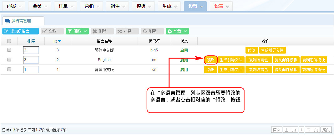 1、在“多語言管理”列表區雙擊您要修改的多語言,或者點擊相對應的“修改”按鈕;