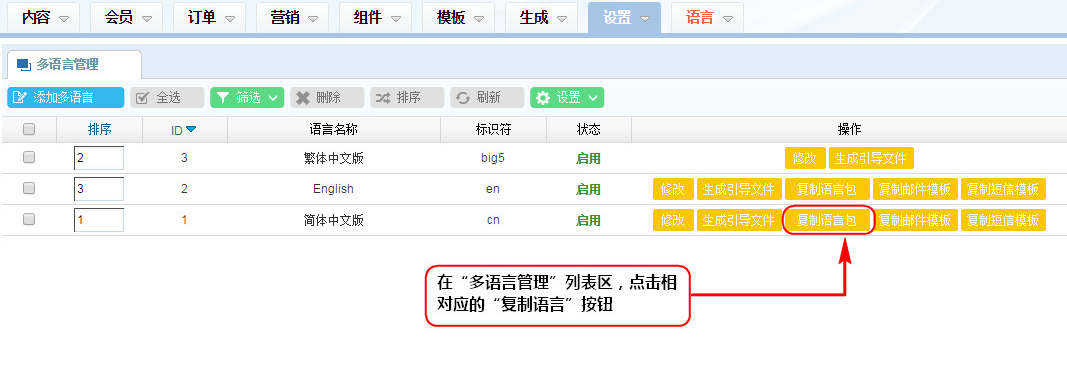 1、在“多語言管理”列表區,點擊相對應的“復制語言”按鈕;