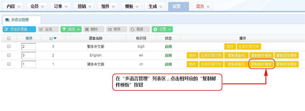 1、在“多語言管理”列表區(qū),點(diǎn)擊相對(duì)應(yīng)的“復(fù)制郵件模板”按鈕;