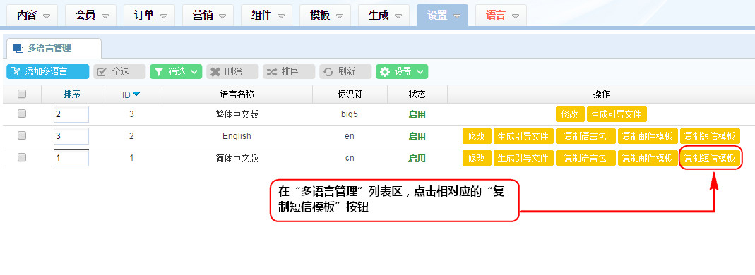 1、在“多語言管理”列表區(qū),點擊相對應(yīng)的“復(fù)制短信模板”按鈕;