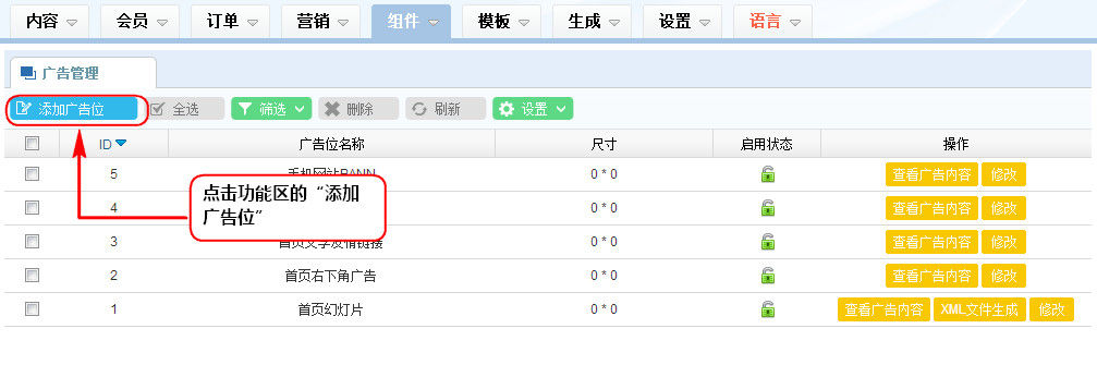 1、在廣告管理當前窗口區,點擊功能區的“添加廣告位”;