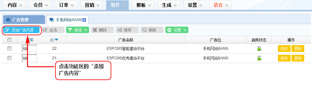 2、在廣告內(nèi)容管理當(dāng)前窗口區(qū),點(diǎn)擊功能區(qū)的“添加廣告內(nèi)容”;