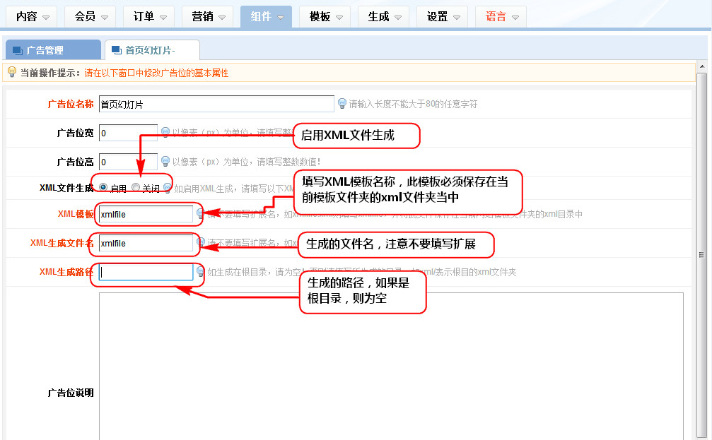 1、添加或修改廣告位的界面中,啟用XML文件生成功能,啟用XML文件生成,填寫XML模板、生成的XML文件名、及生成路徑;說明:XML模板必須使用XML文件,相關(guān)的標(biāo)簽嵌套與html標(biāo)簽嵌套類似。