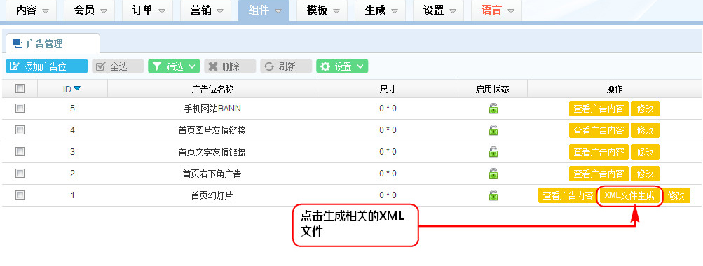3、點(diǎn)擊廣告位列表區(qū),點(diǎn)擊生成相關(guān)的XML文件;