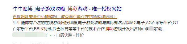 在百度搜索快照上面,客戶的網站快照信息已經被篡改了, 甚至出現了百度網址安全中心的提醒,點開后出現危險提示: