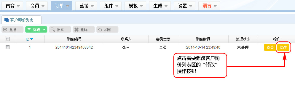 1、在客戶詢價列表管理區,點擊需要修改客戶詢價列表區的“修改”操作按鈕;