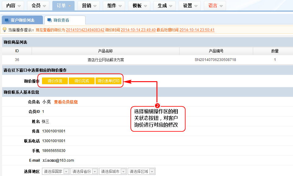 2、要出來的客戶詢價查看窗口中,選擇編輯操作區的相關狀態按鈕,對客戶詢價進行對應的修改;