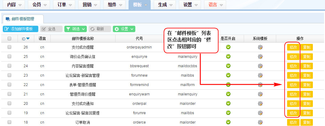 1、在“郵件模板”列表區點擊相對應的“修改”按鈕即可;