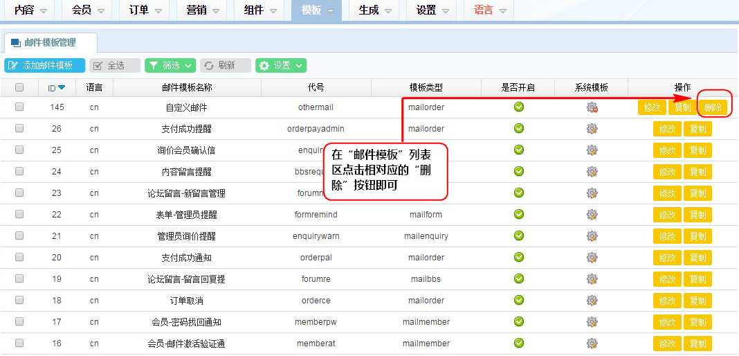 1、在“郵件模板”列表區點擊相對應的“刪除”按鈕即可;