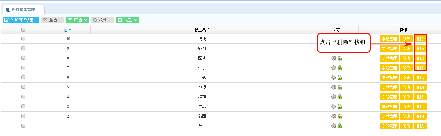 1、在模型管理列表區,在需要刪除模型列表的操作區,點擊“刪除”按鈕即可;