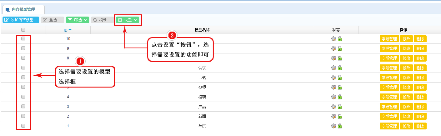 1、在模型管理列表區,選中需要設置的模型選項框;