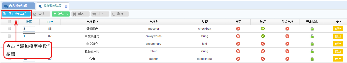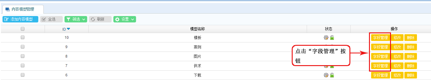 1、在模型管理列表區,點擊您需要管理的模型列表中的“字段管理”按鈕;