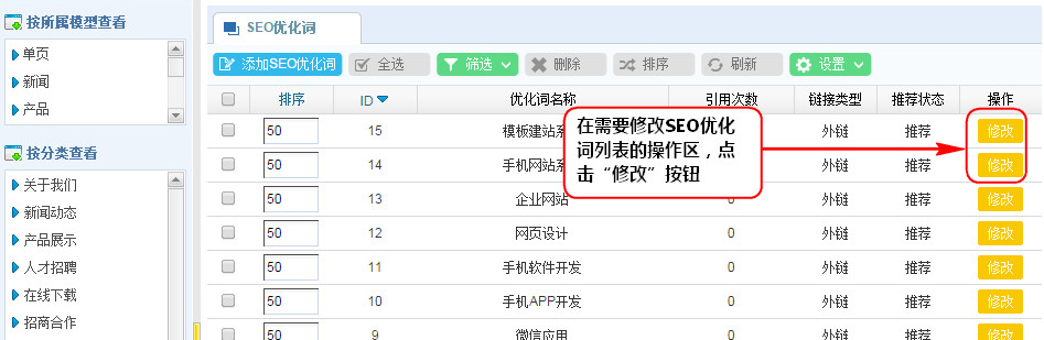 1、在SEO優化詞管理列表區,在需要修改SEO優化詞列表的操作區,點擊“修改”按鈕;