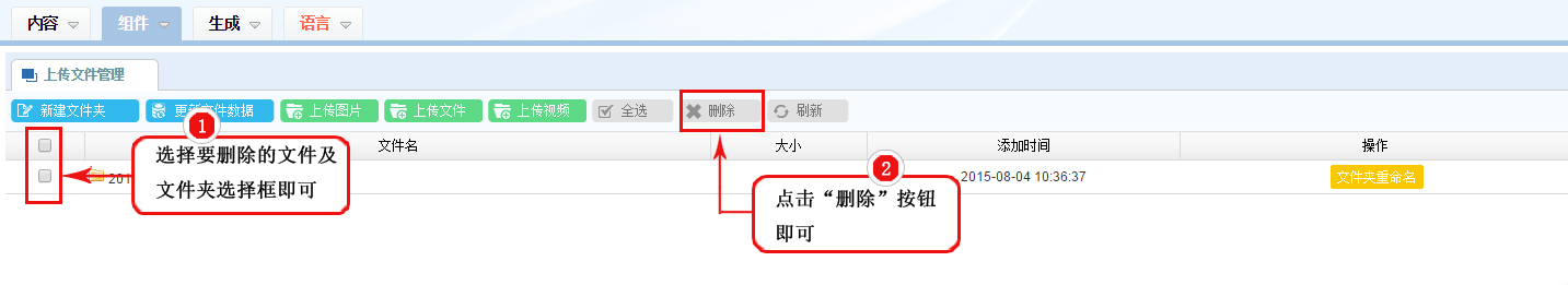 1、在“上傳文件管理”列表管理區,選中要刪除文件及文件夾的選項框;