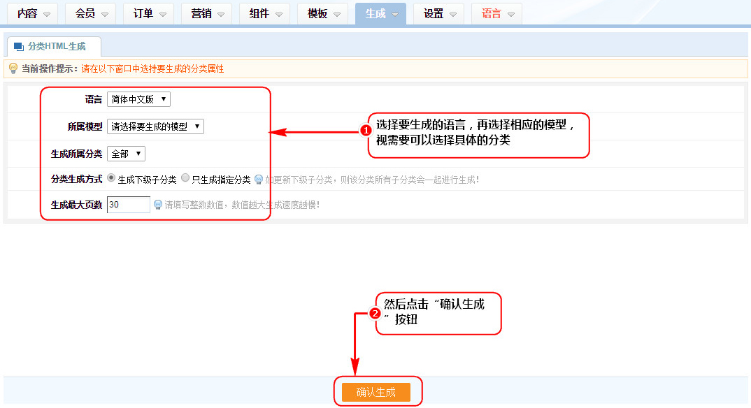 說明:如果點擊生成下子級分類,則該分類所屬下列N級分類將會一起生成,否則只生成當前選擇的分類。另外,本功能只是生成分類頁面,該分類下面的內容頁面不會生成。