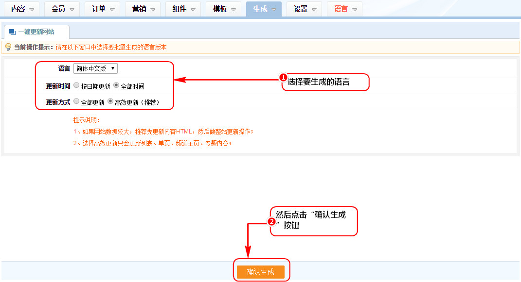說明:如果網站數據較大,推薦先更新內容HTML,然后做整站更新操作,選擇高效更新只會更新列表、單頁、頻道主頁、專題內容;