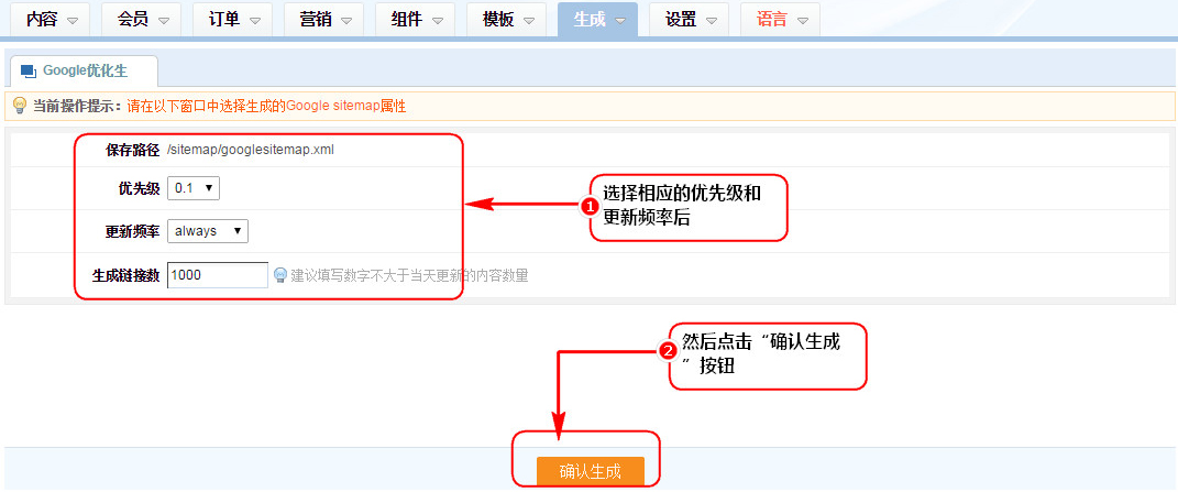 Google優化生成操作主要用于生成Google抓取xml網站地圖文件生成,進入Google優化生成操作辦法為:點擊“生成”→“Google優化生成”菜單即可。