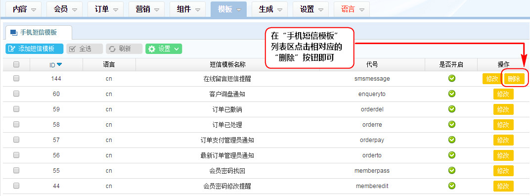 1、在“手機短信模板”列表區點擊相對應的“刪除”按鈕即可;