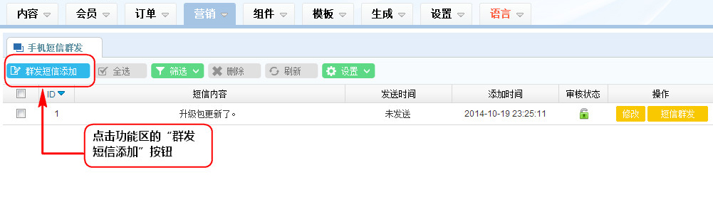 1、在手機(jī)短信群發(fā)列表區(qū),點(diǎn)擊功能區(qū)的“群發(fā)短信添加”按鈕;