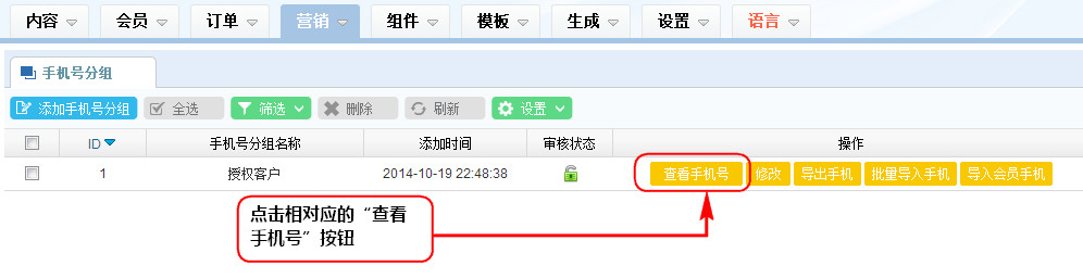 1、在手機號分組列表區,點擊相對應的“查看手機號”按鈕;