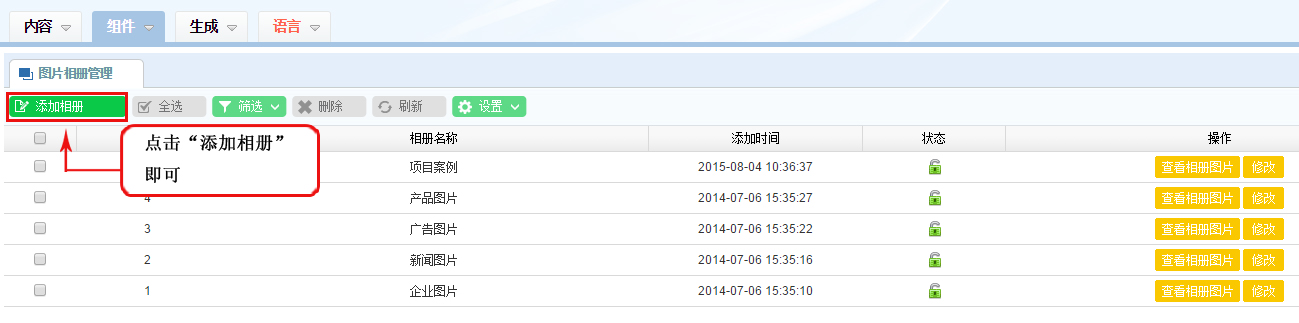 1、在“圖片相冊管理”窗口區,點擊功能區的“添加相冊”;