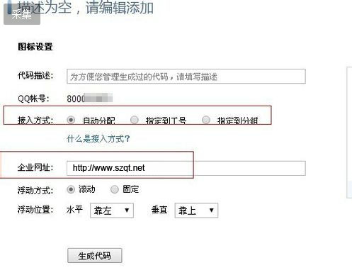 風格一選定后,在接入方式上選擇”自動分配“,企業網址上填上你的企業網址,然后點擊生成代碼即可,如圖: