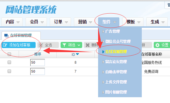 生成代碼并復制后,進入全通網站管理系統后臺,登錄后找到 組件 - 在線客服管理,如圖: