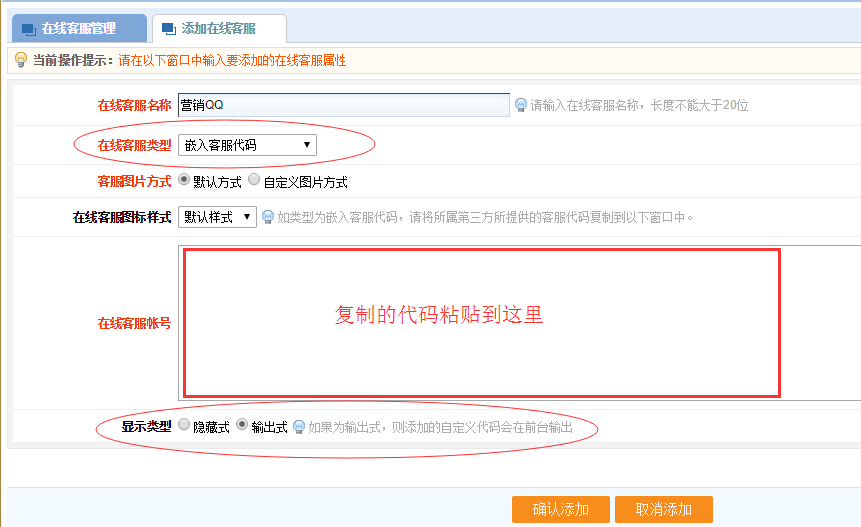 這里我們可以點擊 添加在線客服 按鈕,在線客服類型 選擇 嵌入客服代碼,然后將代碼貼入 在線客服帳號 欄內,顯示類型 選擇 輸出式,然后確認添加即可,如圖:
