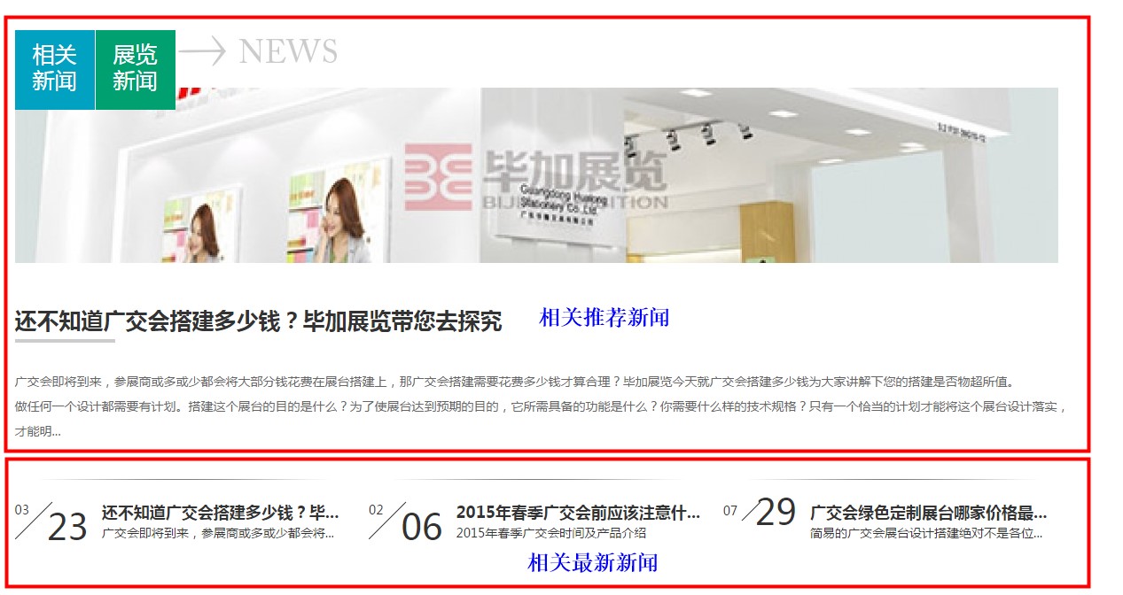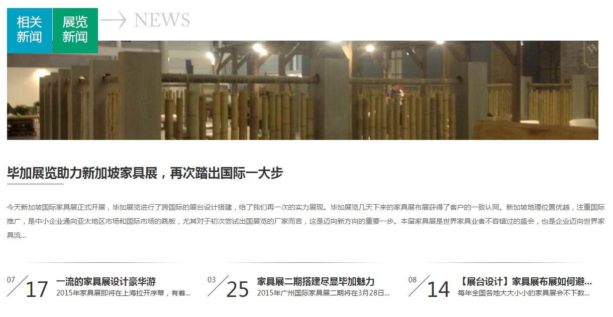 畢加展覽案例展示,主要分為展覽展臺、企業(yè)展廳、主場活動、環(huán)保展臺四個大分類,里面還有很多子分類,我們在每個大小分類下面都放了一個相關(guān)新聞的欄目,對應(yīng)每個分類的內(nèi)容,方便客戶了解最新的相關(guān)資訊。