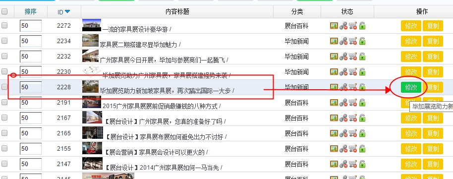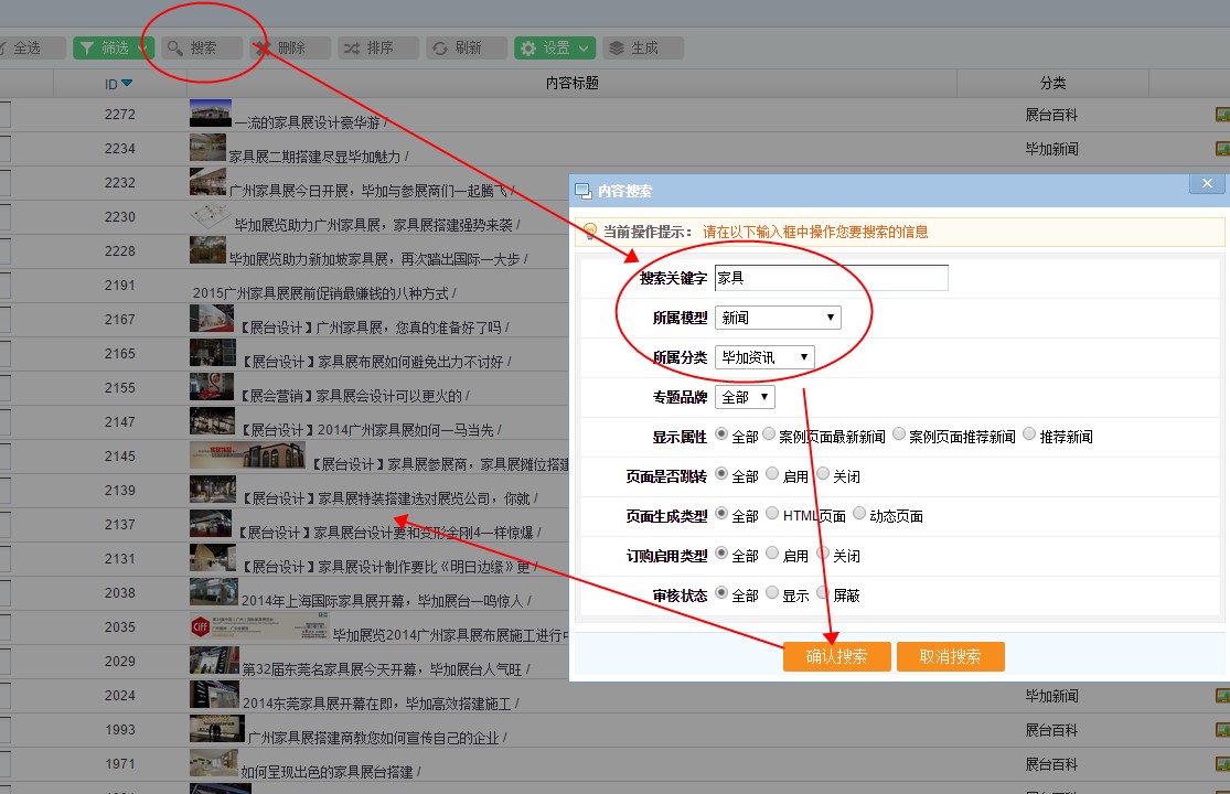 3. 列表里的新聞很多,怎樣才能在后臺上找到 家具家居展覽展臺 的相關(guān)新聞呢,一個一個找太費神了,我們還是用搜索吧。