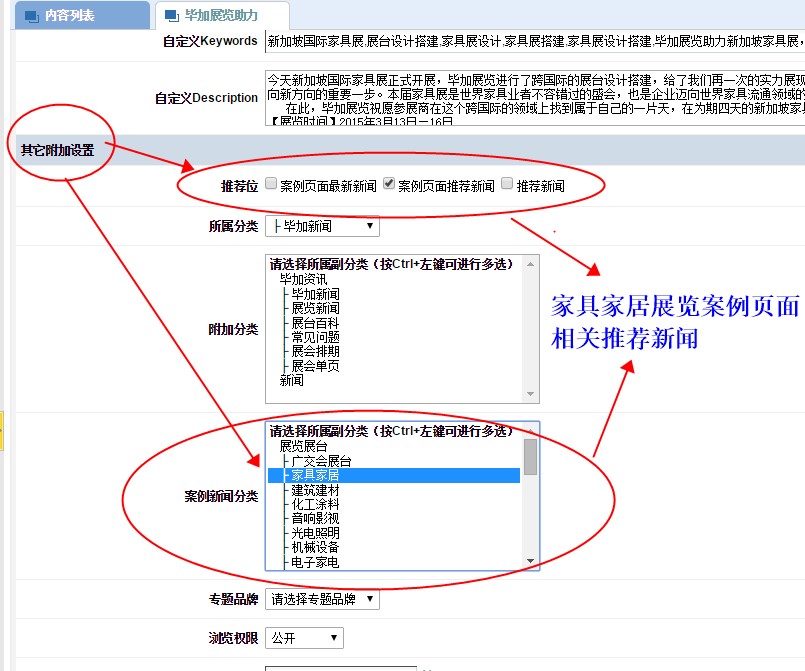 此處有兩個選項需要選擇,一個是推薦位:設(shè)置該新聞是顯示在 相關(guān)推薦新聞 還是 相關(guān)最新新聞 ,另外一個是 案例新聞分類: 選擇該新聞所對應(yīng)的案例分類,這里我們選擇家具家居分類,然后確認(rèn)添加。