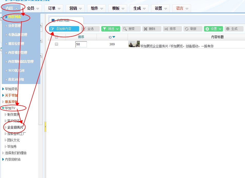 A. 進(jìn)入后臺(tái) - 內(nèi)容 - 內(nèi)容列表 - 畢加TV-要添加的TV分類,然后點(diǎn)擊列表頁面上方的添加新內(nèi)容。