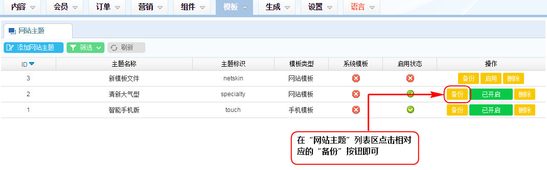 1、在“網站主題”列表區點擊相對應的“備份”按鈕即可;