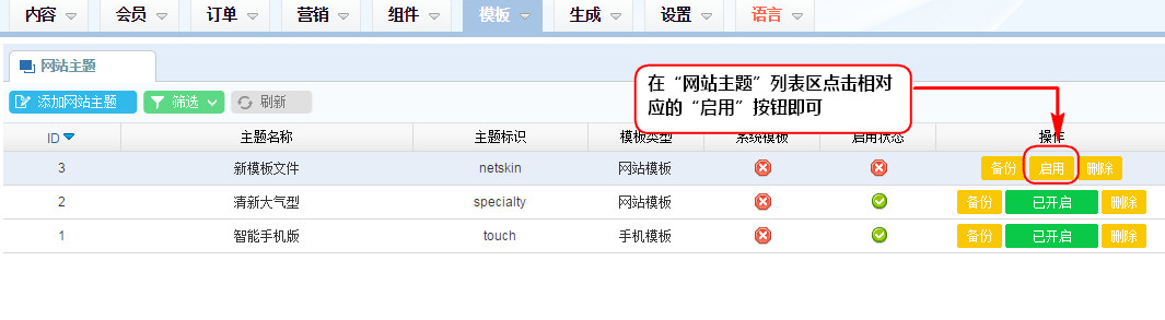 1、在“網站主題”列表區點擊相對應的“啟用”按鈕即可;