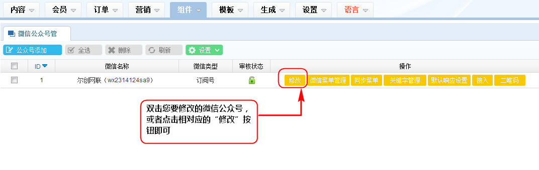 1、在微信公眾號(hào)管理列表區(qū)雙擊您要修改的微信公眾號(hào),或者點(diǎn)擊相對(duì)應(yīng)的“修改”按鈕即可;