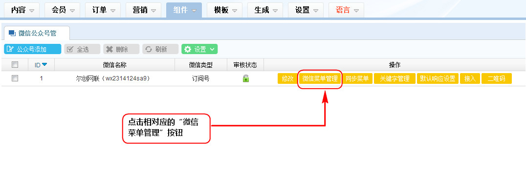 1、在微信公眾號管理列表區,點擊相對應的“微信菜單管理”按鈕;