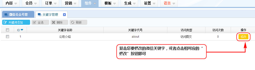 1、在微信關(guān)鍵字管理列表區(qū)雙擊您要修改的微信關(guān)鍵字,或者點(diǎn)擊相對(duì)應(yīng)的“修改”按鈕即可;