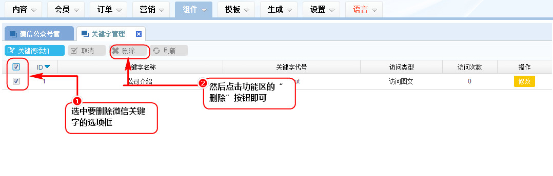 1、在微信關鍵字列表管理區,選中要刪除微信關鍵字的選項框;
