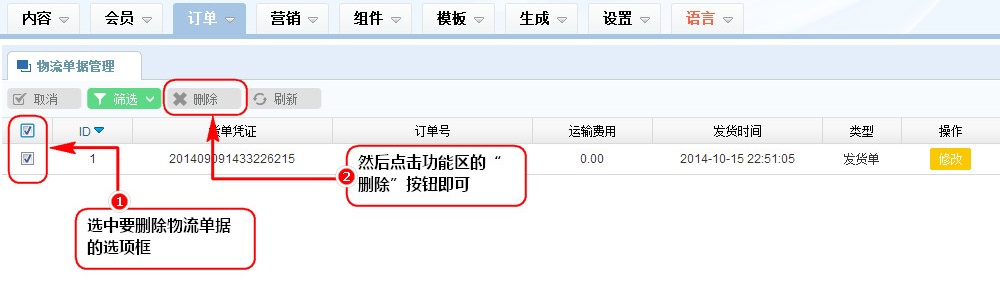 1、在物流單據(jù)列表管理區(qū),選中要?jiǎng)h除物流單據(jù)的選項(xiàng)框;