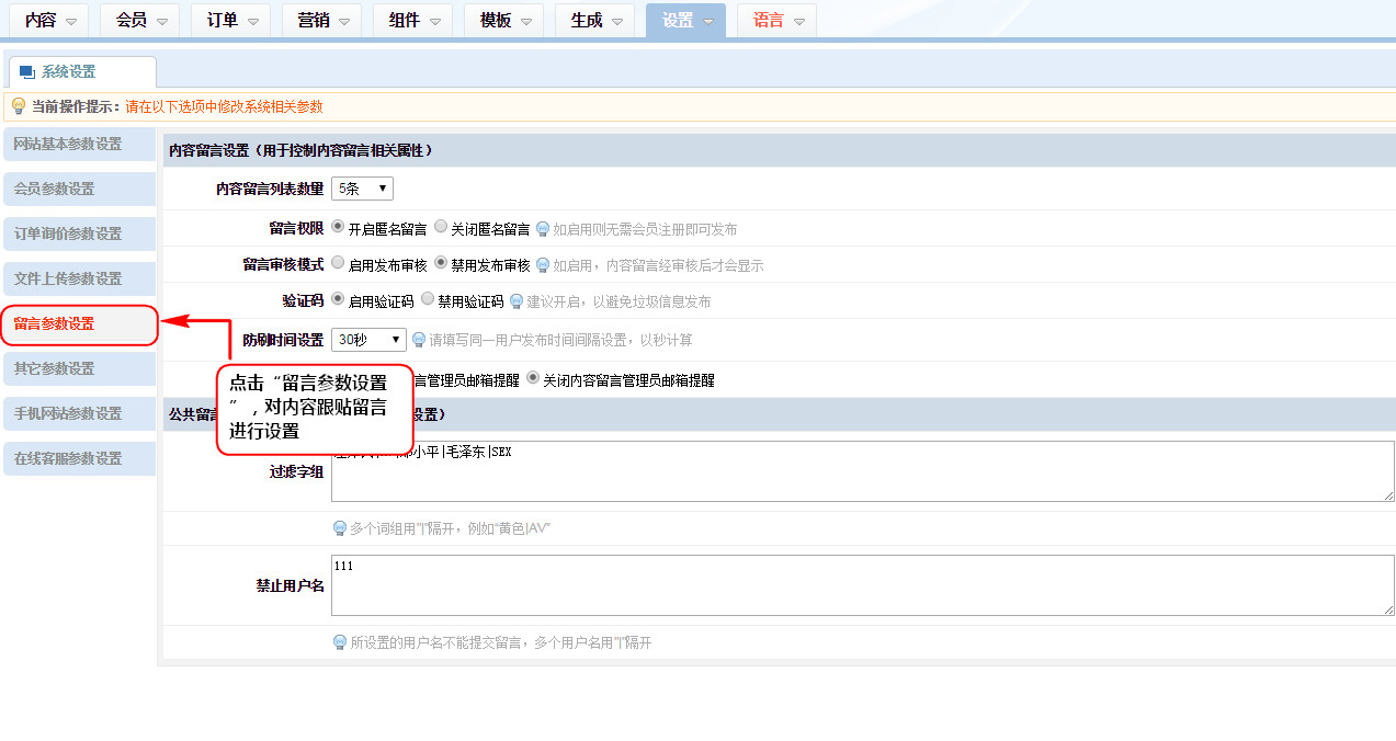 1、內容留言列表數量:內容跟貼每頁顯示的數量,請注意此列表數量非留言板列表數量,而是內容跟貼顯示數量,比如新聞跟貼,產品跟貼;