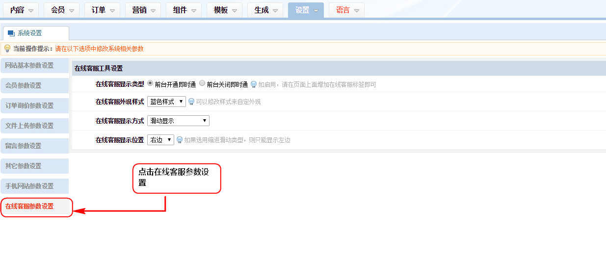 1、說明:在線客服啟用后,可以在模板上面進行調用,具體調用方法請參考LIST輸出標簽中的im即時通輸出;