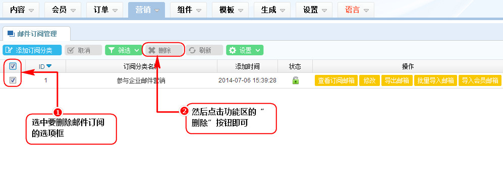1、在郵件訂閱列表管理區,選中要刪除郵件訂閱的選項框;