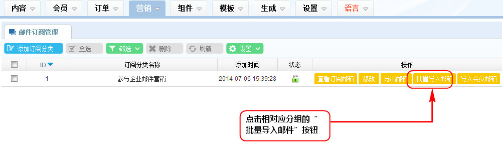 1、在郵件訂閱列表區,點擊相對應分組的“批量導入郵件”按鈕;