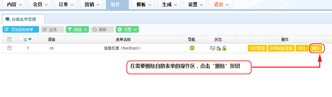 2、說明:刪除自助表單后,相關自助表單留言內容也會刪除,請謹慎操作。