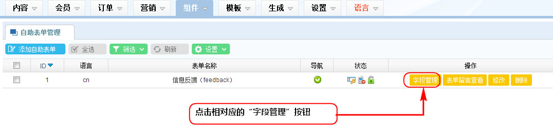 1、在“自助表單管理”列表區,點擊相對應的“字段管理”按鈕;