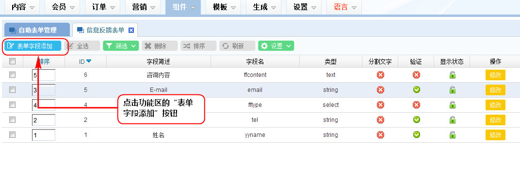 2、在“自助表單字段管理”列表區,點擊功能區的“表單字段添加”按鈕;
