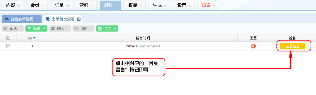 1、在“自助表單留言查看”列表區(qū),點擊相對應(yīng)的“回復(fù)留言”按鈕即可;