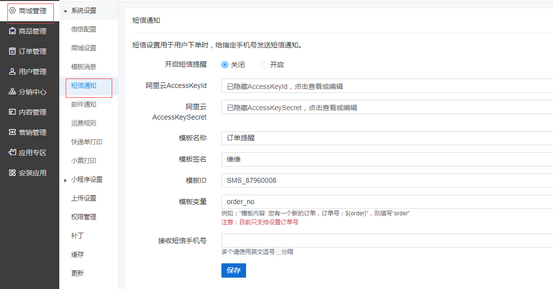 - 將所有信息提交到商城后臺(tái)-短信設(shè)置